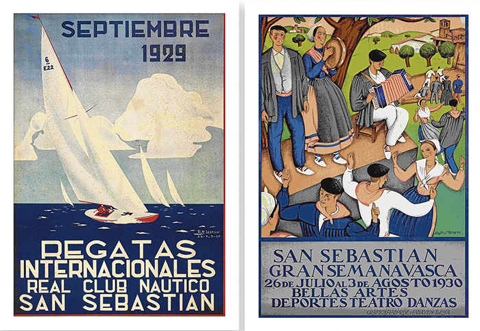 A la izquierda, diseño gráfico que anunció las regatas internacionales de 1929 del Real Club Náutico de Donostia, obra de Rafael Penagos. A la derecha, cartel de Carlos Landi (1930), propiedad del Museo San Telmo.