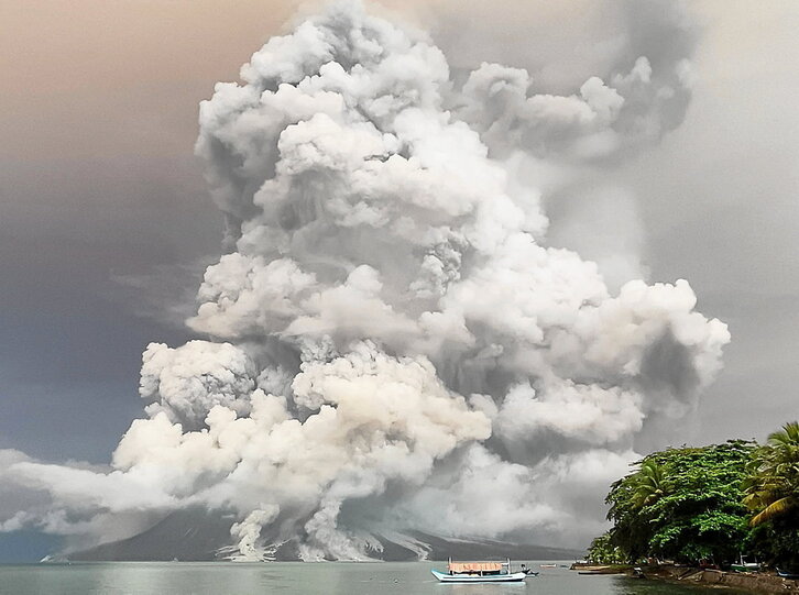 La erupción de los volcanes es un fenómeno geológico que produce imágenes espectaculares como esta, correspondiente al monte Ruang, un volcán de 725 metros de altura ubicado en el norte de Sulawesi y asentado en una pequeña isla de Indonesia de unos 5 kilómetros de ancho sobre la que ‘llueve ceniza’. La fotografía da buena cuenta de esa nube gris que se extiende hasta el cielo y contrasta con la imagen de aparente normalidad de esa barca desde donde seguro que la escena impresiona. Indonesia se encuentra dentro del Anillo de Fuego del Pacífico, una zona de abundante actividad sísmica y volcánica que a lo largo del año es sacudida por unos 7.000 temblores, la mayoría de escasa magnitud. Este estado-archipiélago alberga más de 400 volcanes, de los que 129 continúan activos y 65 están calificados de peligrosos. Cada vez que estalla uno, comienzan los problemas por el riesgo que entraña la proyección de rocas incandescentes, la amenaza de tsunamis... Una tremenda pesadilla para los que viven cerca y un hobby para los aficionados al turismo vulcanológico, que los hay. Unos, huyendo de la lava y, otros, sacando la cámara de fotos para inmortalizar el suceso.