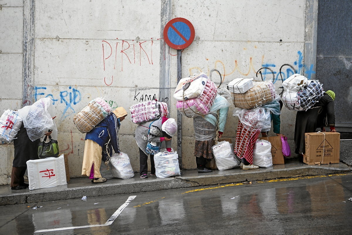 Merkantziaz kargatutako zamaketariek –gehientsuenak emakumeak– ahalegin handiz igotzen dute Biutzeko sarrerara doan malda. Kontrol zurrunak pasatu behar izaten dituzte mugak gainditzeko.