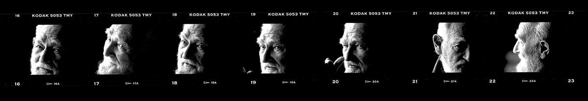 La muestra consta de una selección de 20 fotografías, la mayoría retratos individuales, aunque en el caso de Oteiza ha elegido una serie conformada por seis imágenes. «Son primeros planos en blanco y negro hechos en su casa de Zarautz a finales de los años 80. Es una tira de negativo que digitalicé en su día. Lo que he hecho ha sido positivar. Se puede ver incluso la marca de la película; se asemeja a una hoja de contactos», señala.