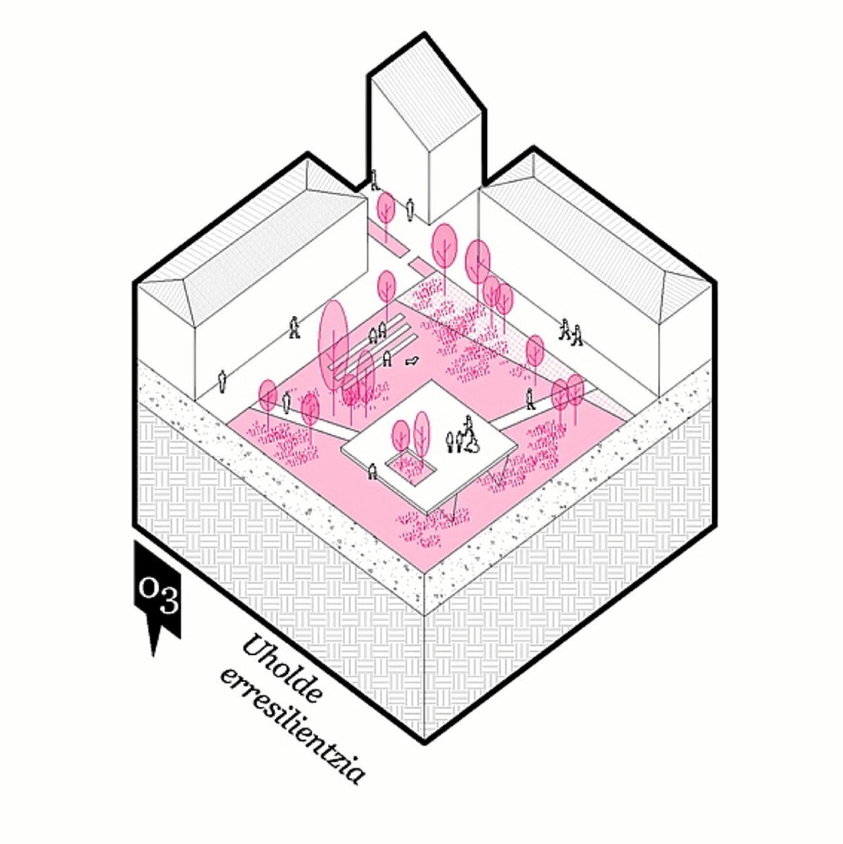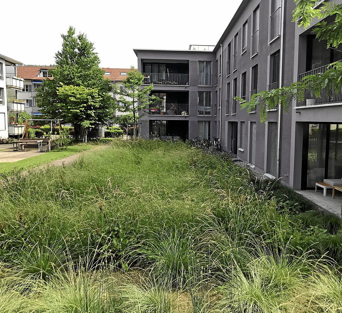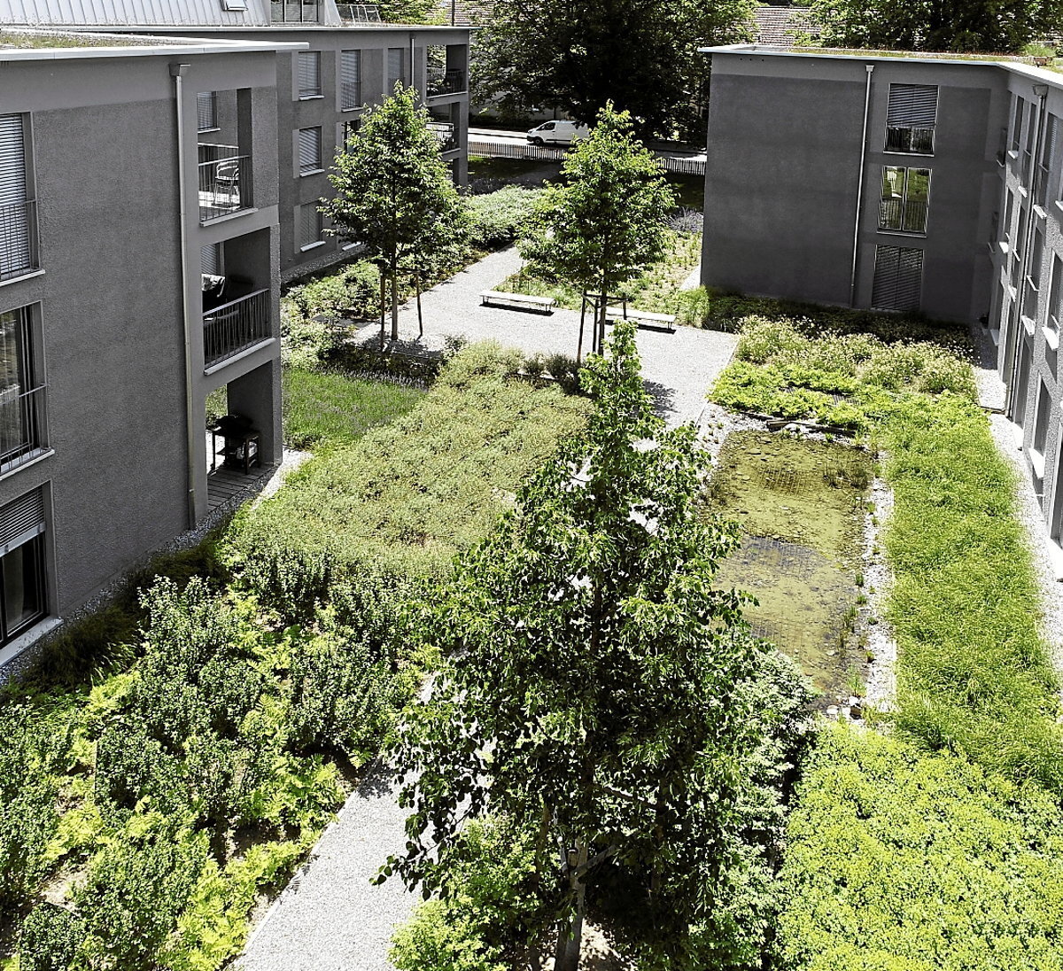 Etxe artean tartekaturiko eremuak batik bat, bizilagunen bizi-kalitatea hobetzeko helburuarekin ezarri izan ohi dira, horrela aisiguneak sortzeko, besteak beste. Alabaina, egungo krisialdi klimatikoa dela bide, lorategietako parterreen izaera aldatzea premiazkoa da, eta aldaketa txikiekin emaitza handiak lor daitezke mota honetako auzotegietan, eraikinak inguratzen dituzten eremu berdeak berezkoak baitituzte. Neuland ArchitekturLandschaft arkitektura bulegoak, etxebizitza proiektuaren egileak, Naturan Oinarrituriko Soluzioen aldeko apustua egin du eraikinen bitarteko espazioetan, euri-urak kudeatzeko eta bioaniztasuna sustatzeko esparruak diseinatuz. Horrela, airearen kalitatea hobetzeaz gain -hiriko bero-uharte efektua murrizteko-, babeslekua ematen zaio tokiko faunari. Naturarekin harmonian lan egitea da helburua, epe luzera ura modu erresiliente eta jasangarrian kudeatzeko.