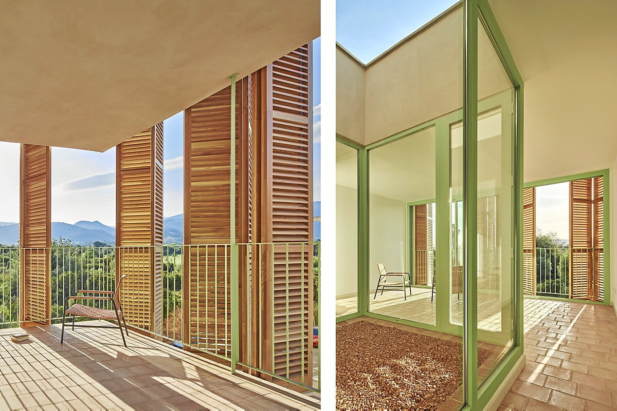 Los arquitectos optan por reinterpretar este sistema mediante contraventanas de madera de alerce, plegables y correderas sobre guías continuas que recorren toda la fachada. Se consigue la uniformidad compositiva en todos los niveles cubriendo con las persianas la totalidad de su altura, independientemente que tras ellas haya ventanas con antepechos ciegos, aperturas acristaladas de suelo a techo o terrazas abiertas.