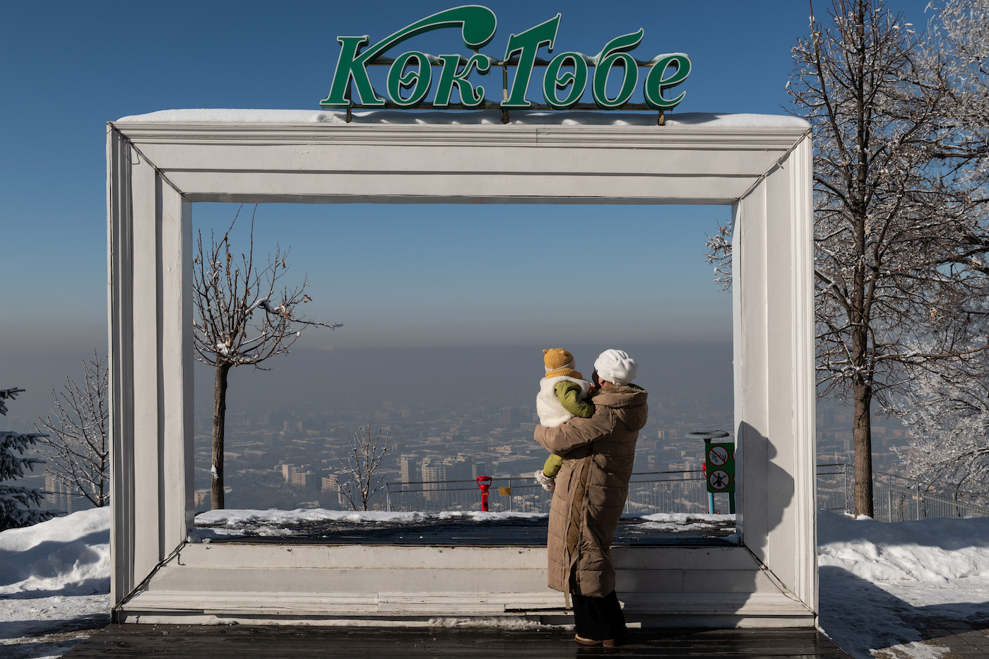 Trans-Ili Que mendiaren tontorrak eta Kazakhstango Almaty hiriaren zati bat, egun eguzkitsu batean, elurte baten ondoren. (Max Zolotukhin | Getty Images)
