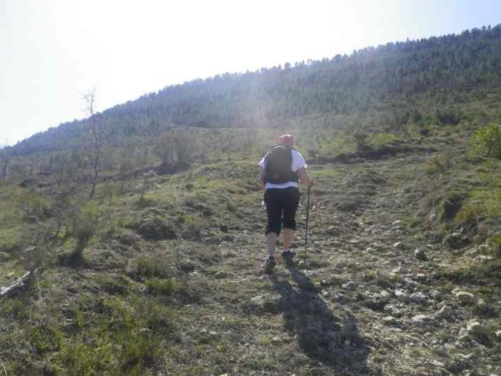 Continuaremos ahora dirección oeste por el sendero que va por el filo de la montaña, paralelos a una langa. Tendremos que resolver una empinadísima bajada entre unas curiosas zarzas que no pinchan, tipo hoja de pino. Según bajamos, veremos a lo lejos los salvajes montes de la zona del norte de Burgos. Y es que estamos en la última montaña de la zona oeste de Valderejo y la sensación de soledad es tan grande como gratificante.