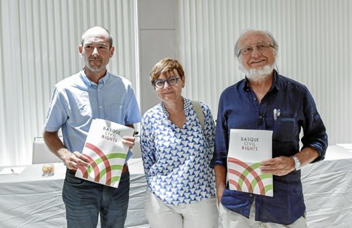 Paul Ríos, excoordinador de Lokarri; Pedro Ibarra, catedrático de Política de la UPV-EHU; y Gemma Zabaleta, exconsejera de Lakua por el PSE, presentaron ayer una dinámica en favor del derecho de Arnaldo Otegi a presentarse como candidato a lehendakari. En Donostia, con numerosa asistencia de medios de comunicación, dieron a conocer la campaña, secundada inicialmente por 127 representantes políticos y sociales de diversos sectores de Euskal Herria e internacionales, entre los que hay gentes muy conocidas y una pluralidad ideológica evidente.