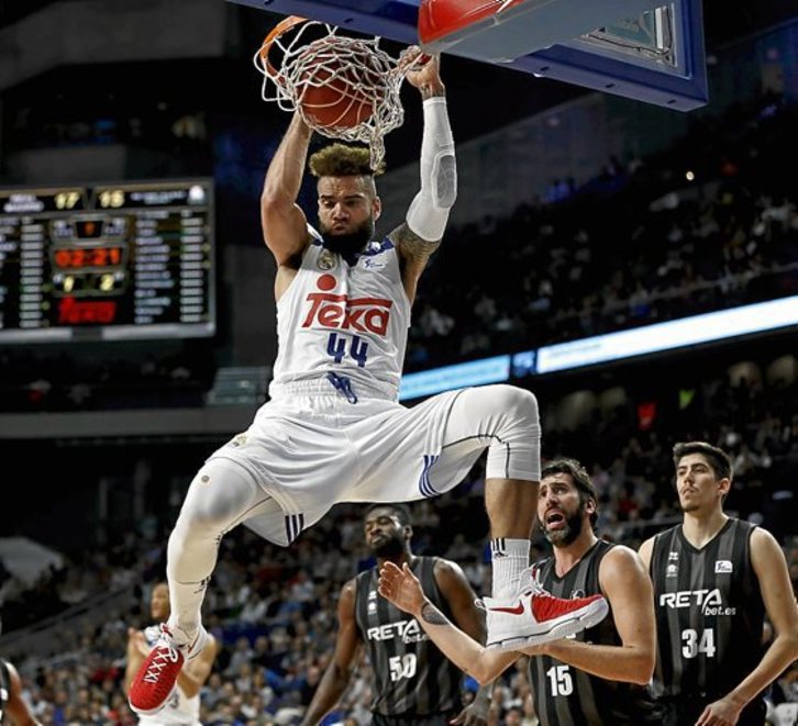 La sensación era molesta desde el arranque, porque parecía que el Real Madrid jugaba con el freno de mano echado, a la espera del momento de finiquitar el partido. Entre tanto, los hombres de negro aguantaban la estela. Primero fueron los triples de Lapornik, titular ante la ausencia de Bamforth, y Tabu, de regreso de su lesión, los que ejercían de «chicle» en el zapato madridista, para que en el segundo cuarto fueran las continuaciones del pick’n roll central de Buva y la brega de Michael Eric los que hicieran la propio.