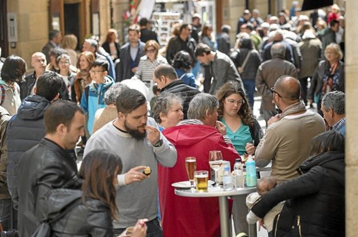 Todavía no era la hora de comer pero un grupo de japoneses que salía de la calle Mayor ya no tenía hambre pues se habían hartado a pintxos. Con un inglés bastante reducido pero con muchos gestos hicieron saber que les gusta la gastronomía y que no podían resistirse a pedirse un par de pintxos en cada bar. ¿Lo más reclamado? «Txakoli and gilda».