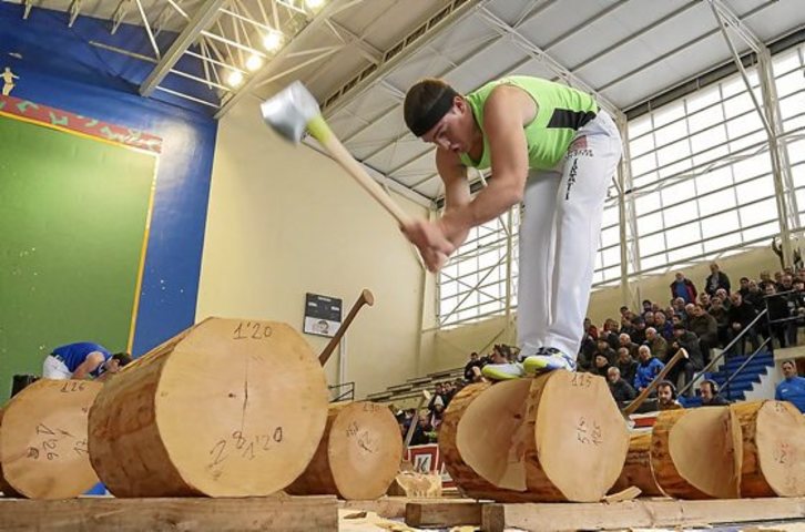 45 ontzako enborra zeinek kolpe gutxiagotan moztu neurtu ziren hasteko, eta 21 kolpetan bukatu zuten jarduna Larrañagak eta Larretxeak, aurkariei baten aldea kenduz. Ondoren, erlojuz kontra zeinek 45 ontzakoa lehenago bota lehiatu ziren, eta nafarrak eta gipuzkoarrak 47 segundoan bota zuten enborra, aurkariei 12 segundoko tartea kenduz.
