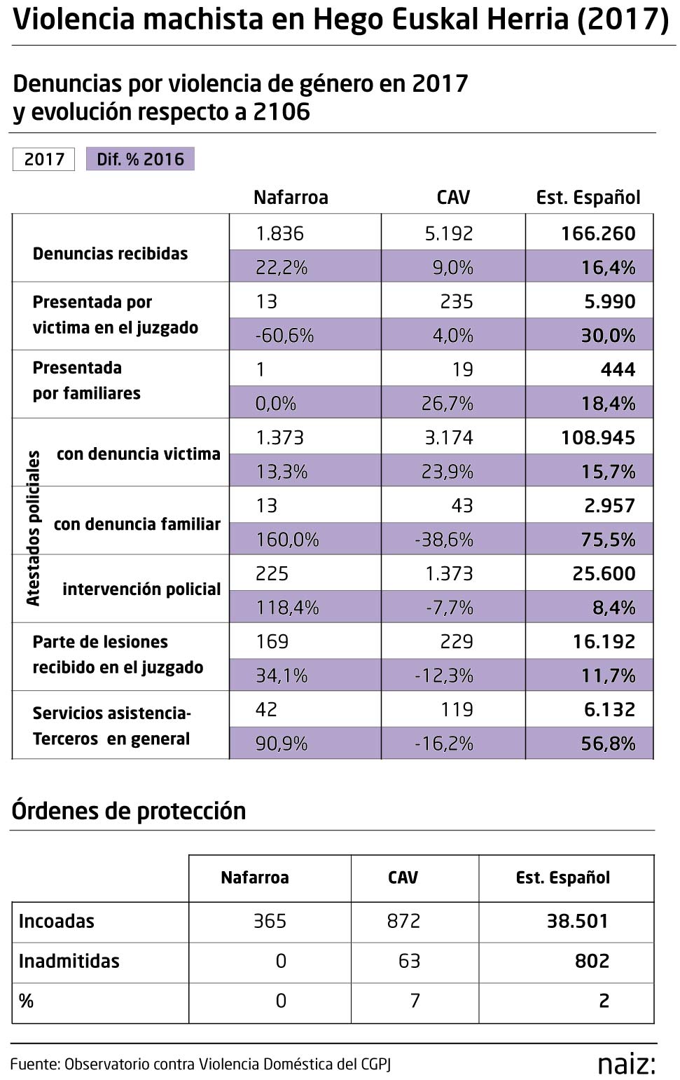 Los datos ofrecidos ayer por el Observatorio estatal dependiente del Consejo General del Poder Judicial sí apuntan a que el número de denuncias se va acercando posiblemente al de casos reales. En el conjunto del Estado ha habido 16,4% más que en 2016. En la CAV el porcentaje ha aumentado un 9% y en Nafarroa un 22,2%, con lo que la media ponderada de aumento es 11,9%. Sobresale el caso navarro, dado que el año anterior también hubo un gran ascenso en el número de denuncias, de modo que en 2017 ya ha habido 54% más referencias que en 2015.
