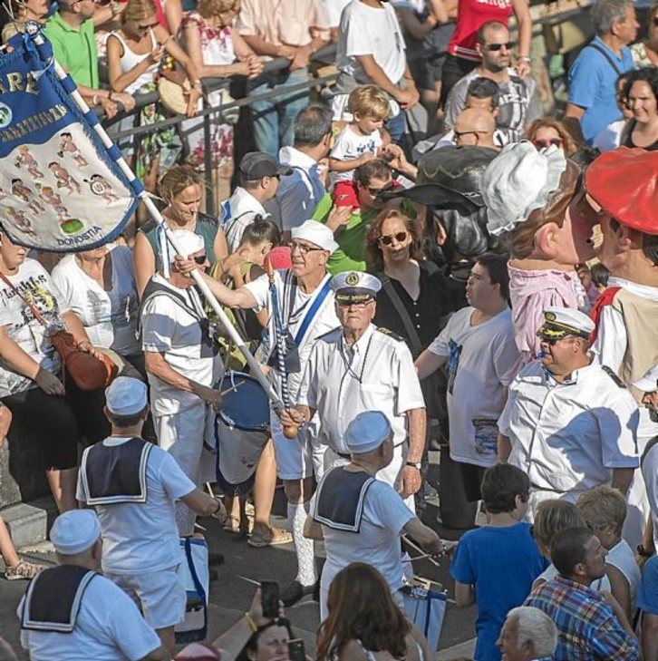Hubo humareda igualmente por partida doble; no se había disipado aún el polvo blanco del cañonazo y ya se atisbaba humo morado, el color de las fiestas vascas de este año, en el muelle para recibir a Matti y Ezkila Kapitaina. También gigantes en legítima competencia: los de Itzurun más ponpoxos, pero los hankapalus piratas bien voluntariosos. Los Bebés de la Bulla sonaban a un lado del Bulebar mientras en el contrario atronaba la batukada. Y hasta en 31 de Agosto había competencia, en hacer el bruto: mientras al norte, en la Trini, algunos se dejaban el lomo levantando el pedrusco de Igeldo, al otro se alzaba vidrio y se llenaban panzas sin mucho miramiento, que para eso estamos ya en fiestas.