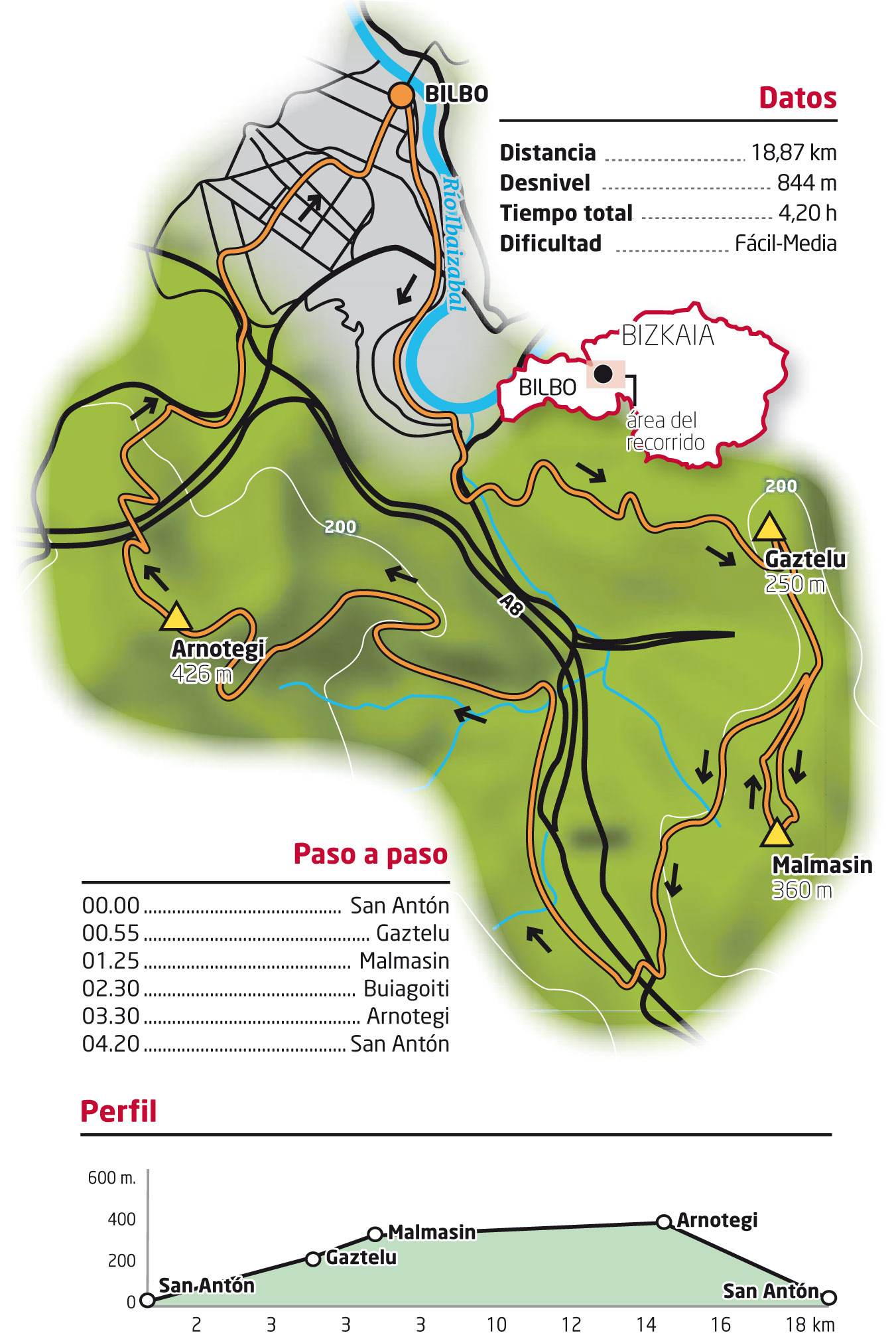 Iniciamos un rápido descenso por senda, que alcanza una pista con mesas recreativas. Allí, por la derecha primero, por la izda después, y nuevamente por la derecha, tomando un sendero-atajo que evita curva, alcanzamos un nuevo conjunto de mesas y una valla de madera similar a la vista en el ascenso, e indicadora de que el tramo montañero finaliza. Por su derecha y por su frente, sobrepasamos la A-8, y a la derecha, descendemos por Kanpazargaina, Askatasuna Etorbidea, junto al Bilbao Arena, y tras giro a la izda llegaremos directos a San Antón por su célebre puente (4h 20´).