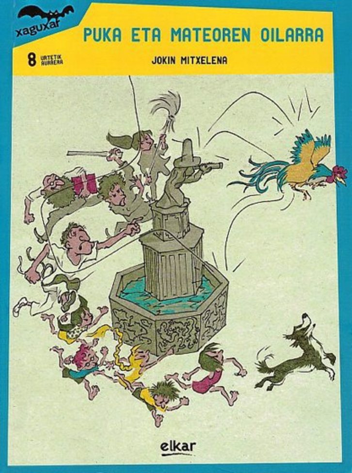 Dena dela, ez gaude idazle-ilustratzaile tandemean Mitxelena bakarrik ikustera ohituta. Izan ere, euskarazko haur eta gazte literaturako ehunka istorio ilustratu baditu ere, lauzpabost baino ez dira bere-bereak, besteak beste: “Xaguxarrarena” (Aizkorri, 2002), “Saguzarrak egunez” (Aizkorri, 2011), “Puka, erleak eta traktorea” (Elkar, 2015) eta aurten argitaratu berri duen “Puka eta Mateoren oilarra” (Elkar, 2019). Azken hori, “Puka” zakurraren aurreko istorioa bezalatsu, udako oporraldiak eskaintzen dizkigun asperralditxoetatik ateratzeko ezin aproposagoa da.