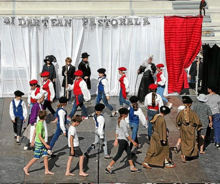 Bidarteko plazako harmailak jendez bete ziren atzo «Bidartean pastorala» ikusteko. Oholtza gainean zeuden eskola publikoko 131 haurren familiek eta euskaltzaleek bete zuten herriko plaza. Erdi Arotik hasita, kostaldeko herriaren historia kontatzen duen obrak Zuberoa ere ekarri zuen gogora, bertako pastoralaren koreografia, jestu eta musiken bitartez.