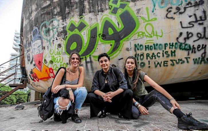 Las declaraciones ayer del presidente libanés, Michel Aoun, no calmaron los ánimos; solamente lograron desilusionar y enfadar más a los manifestantes que han paralizado el país. El levantamiento general que exige la caída del Gobierno se mantiene. En la imagen, tres libanesas certifican ese anhelo de cambio posando frente a un grafiti en árabe con la palabra «revolución».