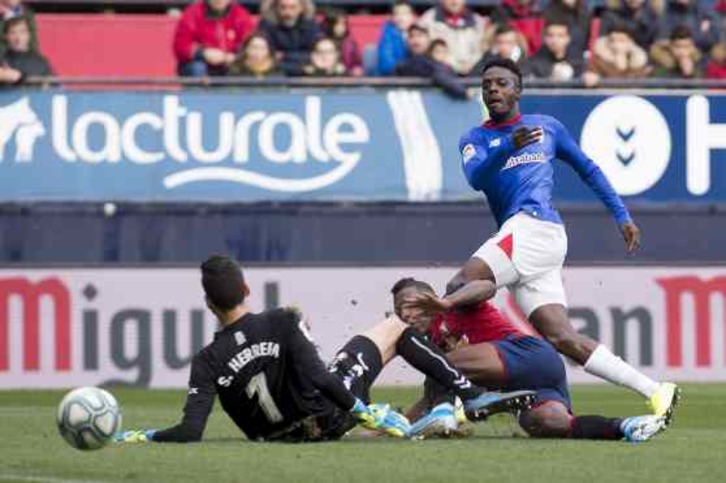 Sin embargo, el equilibrio duró apenas tres minutos. Lo que tardó el Athletic en poner un balón bombeado dentro del área rival, que la zaga rojilla fue incapaz de cortocircuitar hasta por cuatro jugadores para mayor beneficio de los atentos Lekue y Kodro, y gran regocijo de la parroquia rojiblanca desplazada hasta Iruñea, que ya se veía sufriendo hasta el pitido final. El 1-2 resultó un mazazo para los anfitriones, que ya no darían pie con bolo en los últimos diez minutos, mientras los visitantes bien pudieron sentenciar con un disparo con la pierna diestra de Yuri y un mano a mano de Williams, que no supo concretar ante Sergio Herrera.