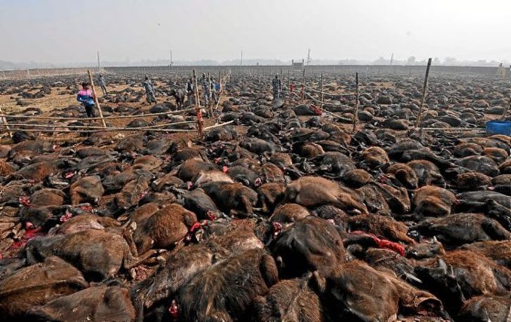 La fiesta hindú de Gadhimai, diosa del poder, se celebra en Bariyarpur, a 160 kilómetros al sur de Katmandú (Nepal). Es un sacrificio ritual donde se decapitan cientos de miles de cabezas de ganado. El hedor de carne cruda flota en el aire y charcos de sangre salpican el suelo fangoso tras una matanza que ni las sentencias judiciales ni los activistas han conseguido detener.