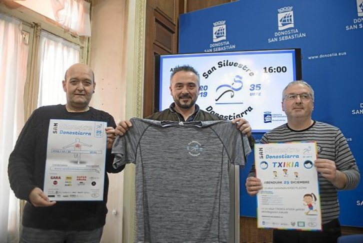 Solo restan 10 días para el fin de año y ya está todo preparado para acoger la 35ª edición de la San Silvestre donostiarra que patrocina GARA y que fue presentada ayer en el Ayuntamiento. La tradicional carrera del 31 de diciembre ha adoptado unas medidas severas como la supresión de bolsas de plástico, botellas y la colocación de contenedores marrones en línea de meta. El objetivo es reducir el uso del plástico año a año, hasta prescindir de él.
