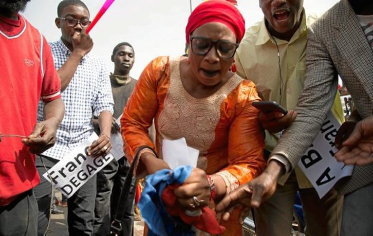 Una mujer rasga una bandera francesa en la concentración convocada en Bamako por el colectivo «Yerewolo» (Parado en las murallas) para exigir la salida de Malí de los militares del Estado francés y de la ONU. Denuncian que detrás de la intervención solo se esconden intereses geoestratégicos y económicos, que no es más que una excusa para mantener el dominio colonial.
