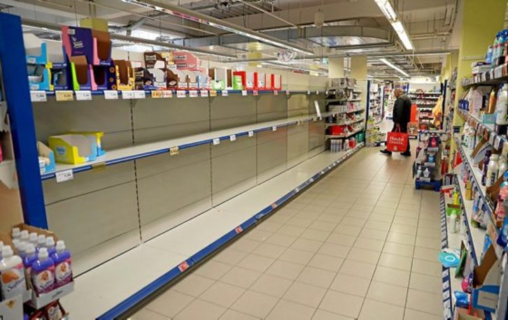 Frankfurteko denda honetan ere bukatu da. Zerk bultzatuta erosten dute hain konpultsiboki Madrileko, Iruñeko, Tolosako edo Alemaniako hiri horretako hainbeste herritarrek? Nolatan agortzen dituzte pertsona osasuntsuek gaixoendako maskarak? Ematen du hainbat faktore nahastu direla: beldurra, berekoikeria, agintariekiko mesfidantza... Baina... komuneko papera? Benetan?