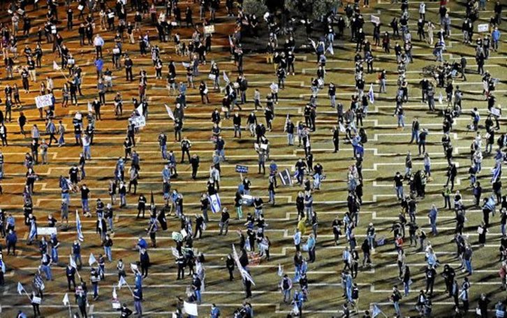 Para poder llevar a cabo una concentración contra el primer ministro israelí, Benjamín Netanyahu, los organizadores tuvieron que marcar en el suelo de la plaza Rabin de la ciudad de Tel Aviv los puntos en los que debía colocarse la gente, además de proveerles de mascarillas. El coronavirus obliga a la protesta ciudadana a reformularse y adaptarse a las nuevas circunstancias.