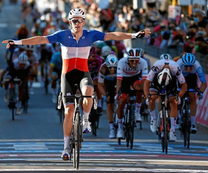 El campeón francés sumaba en la meta de Matera su segunda victoria parcial en esta edición de lacorsa rosa, aparte de arrebatarle la maglia ciclaminoa un Peter Sagan encerrado a la hora del sprint.