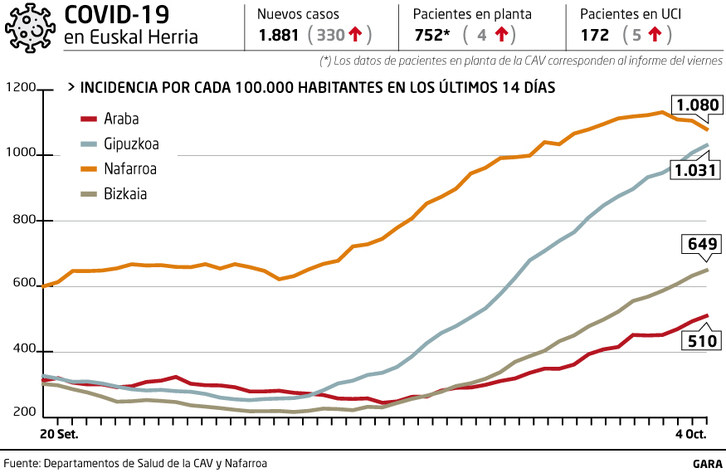 Este herrialde redujo su incidencia acumulada en catorce días por tercer día consecutivo, hasta 1.080 casos por cien mil habitantes, y prácticamente está a la par de Gipuzkoa, que con 671 positivos en 24 horas –nuevo récord– elevó su incidencia a los 1.031,38 casos. De hecho, si en vez de las últimas dos semanas tenemos en cuenta solo los últimos siete días, la incidencia de Gipuzkoa es mayor que la de Nafarroa: 543,33 frente a 511,21.