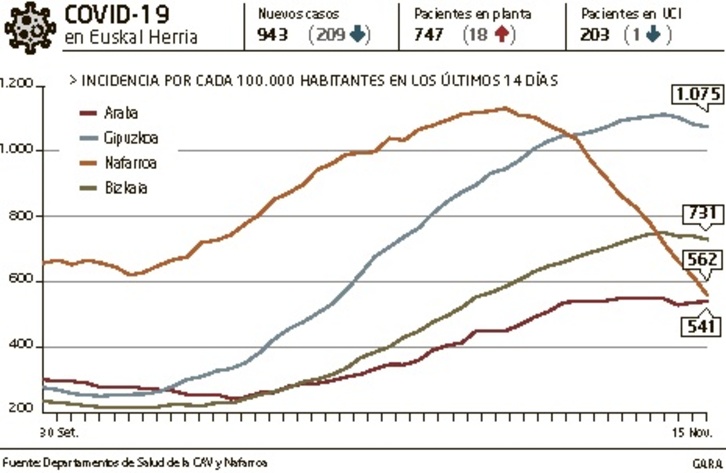 Después de un mes de crecimiento, este pasado fin de semana la incidencia acumulada ha comenzado a reducirse en Araba, en Bizkaia y en Gipuzkoa, y parece que la CAV ha doblado la curva. La cuestión es comprobar si una vez alcanzado ese pico las cifras bajan de forma significativa, como ha ocurrido en Nafarroa, o si se abre una fase de meseta, con los contagios estabilizados en los registros de los últimos días.