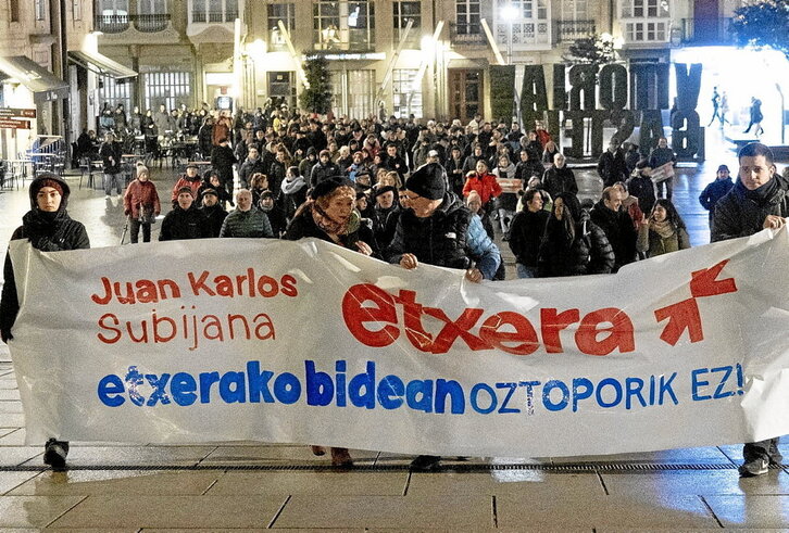 Decenas de personas se manifestaron ayer tarde en Gasteiz para denunciar el encarcelamiento de Juan Karlos Subijana, después de que la Audiencia Nacional anulara su tercer grado, y exigir su vuelta a casa. Sare recordó que, con Subijana, ya son trece los prisioneros que han tenido que volver a la cárcel tras revocarse el tercer grado penitenciario a iniciativa de la Fiscalía del tribunal especial español.Raúl BOGAJO | FOKU