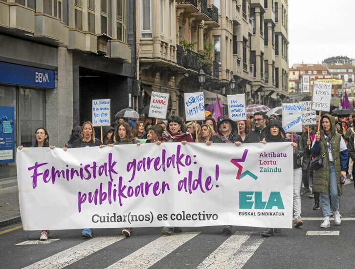 Tras un acto en el teatro Campos de Bilbo, ELA reunió a un millar de personas en una manifestación que finalizó ante la sede de la Diputación, donde, al igual que en la movilización de LAB, se volvió a desplegar un cordón de ertzainas ataviados con casco. Gorka RUBIO | FOKU