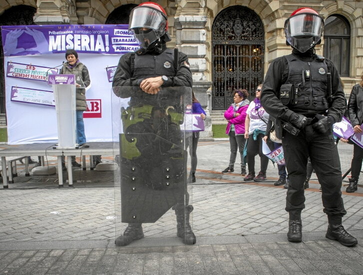 Trabajadoras de sectores feminizados protagonizaron protestas ante instituciones a las que responsabilizan de la precariedad que soportan. «Nos hemos hartado», dijo Garbiñe Aranburu, secretaria general de LAB. A destacar el despliegue de la Ertzaintza ante la Diputación de Bizkaia. Gorka RUBIO | FOKU