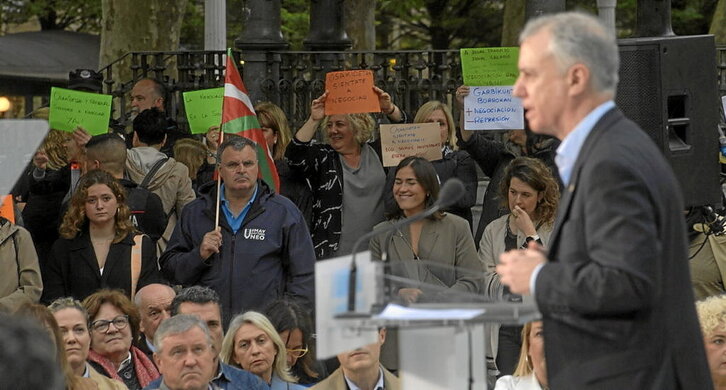 PNV celebró su acto central ayer en Donostia, con el lehendakari Iñigo Urkullu, el presidente del partido, Andoni Ortuzar, y los candidatos a diputada general de Gipuzkoa, Eider Mendoza, y a alcalde de la capital, Eneko Goia. Pasó algo paradójico, porque, mientras Urkullu defendía el modelo de su partido, el del «diálogo y el acuerdo», las trabajadoras de limpieza de Osakidetza protestaron con unos carteles que pedían diálogo y negociación.