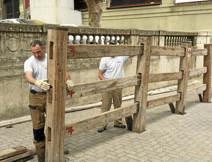 En Iruñea ya huele a fiesta, después de que cinco operarios de la Carpintería Hermanos Aldaz iniciaran ayer el montaje del «tetris» del vallado del encierro, integrado por 900 postes, 2.700 tablones y 2.500 cuñas, con cada una de esas piezas colocada en su correspondiente sitio. La operación comenzó en el tramo del callejón de la plaza y continuará por la cuesta de Santo Domingo en un proceso que se completa a diario durante los sanfermines. Después de décadas ocupándose de esta tarea, Iñigo Aldaz reconoció a los medios que «las piezas están ya en la cabeza».