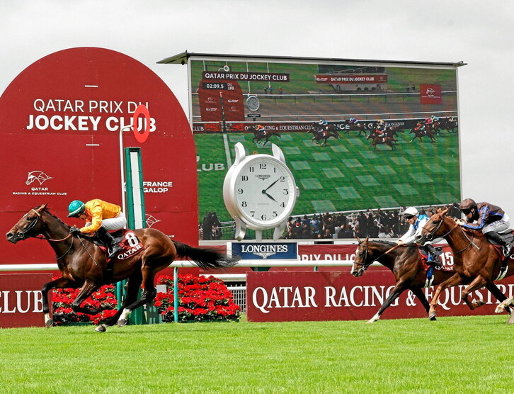 Duela hilabete batzuk, Aiert Alonso artista lekeitiarrak, Hondarribian bizi denak, zaldi lasterketekiko bere liluraz hitz egin zigun Gaur8 gehigarrian. Animalia horien abiadurak eta indarrak margotzeko gogoa eragiten ziotela zioen. Eta ez zegoen oker; ikusi besterik ez dago-eta ugaztun horiek, korrika egiten dutenean, nolako lilura sortzen duten. Irudian, ezkerrean Ronan Thomas jockey frantsesa ageri da, bere zaldi Look de Vegarekin lasterketa batean garaipena eskuratuz. Erdiko erlojuari erreparatuta, argi dago zer ordutan irabazi zuen.
