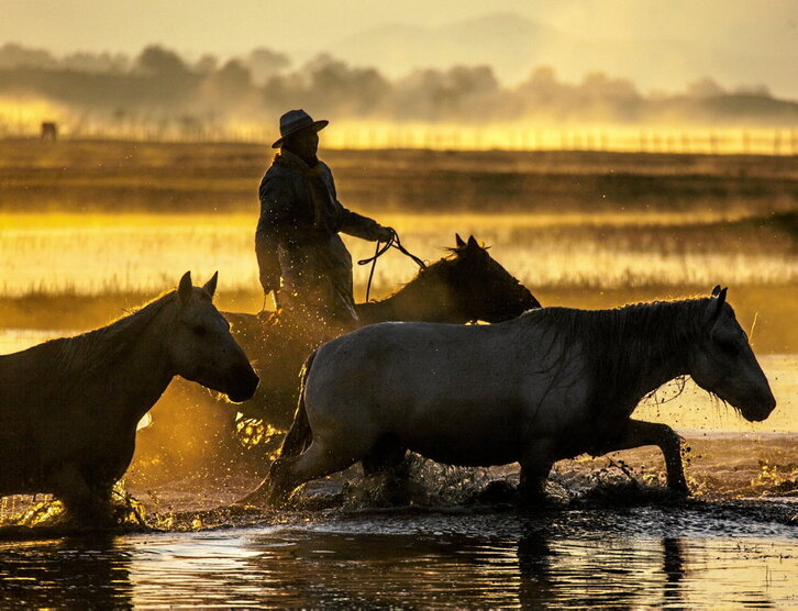 Mendebalde Urrun edo Far West-i buruzko zenbat eta zenbat filmetan ikusi dugu halakorik? Ezin konta. Baita iragarkietan, karteletan eta abarretan ere. Garunean ondo iltzatutako iruditeriaren parte da cowboya zaldi gainean, urruntzen edo hurbiltzen, ilunabarreko tapiz gorrixkan silueta ederra marrazten duela. Bada, argazkikoa ere urrunekoa da guretzat, baina kasu honetan Ekialdekoa: zalduna Chifeng-eko -Txinako Herri Errepublikako eskualde autonomo Barne Mongolian- ibai bat zeharkatzen ageri da, abere batzuk lekualdatzeko lanean.