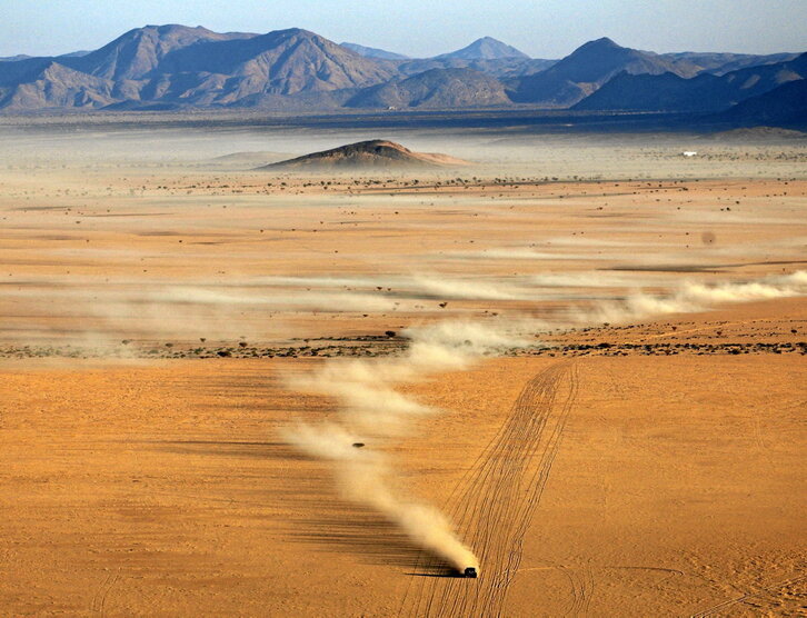Zazpi mila kilometro luzeko basamortuan barrena, Arabia Saudiko dunetan barrena. Historia aberatsa dauka Dakar rallyak -lehengo Paris-Dakar-. Duela urte batzuetatik hona Ekialde Hurbileko estatu burujabe handienak bereganatu duen auto, moto eta kamioien lasterketa honek -bost kategoriatan jokatzen da- urtero lehenengo egunetan irudi eder bezain gogorrak uzten dizkigu. Urtarrilaren 17an bukatuko da aurtengo edizioa, Shubaytah herrian. Irudia bigarren etapakoa da, Bishako basamortuan barrena, lehiakideak helmugaren bila ari direla.