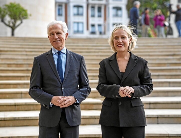 El Museo Guggenheim hacía público el pasado mes de noviembre la decisión de nombrar como nueva directora general a Miren Arzalluz, pero no fue hasta la jornada de ayer cuando la pinacoteca bilbaina ofrecía un posado de la directora general electa junto con el director saliente, Juan Ignacio Vidarte, para visibilizar de ese modo el proceso de «inmersión» que llevará a la especialista bilbaina a dirigir el mayor proyecto museístico de Euskal Herria. Arzalluz inicia así un camino transitorio que culminará con su nombramiento oficial el próximo 1 de abril.