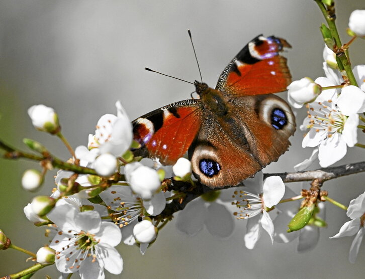 Desde que empezó el pasado jueves a las 10.02, hora de Euskal Herria, la primavera ya se está haciendo presente en el paisaje con su colorido y generando estampas como esta. Fue tomada ayer en Fráncfort y en la misma aparece una mariposa pavo real posada sobre las flores de un cerezo, una de las primeras especies de árbol que celebran el cambio de estación luciendo un inmaculado blanco en sus ramas. Esa flor tiene un doble simbolismo, ya que representa la nueva vida que trae consigo la primavera, pero también la muerte a causa de su efímera existencia.