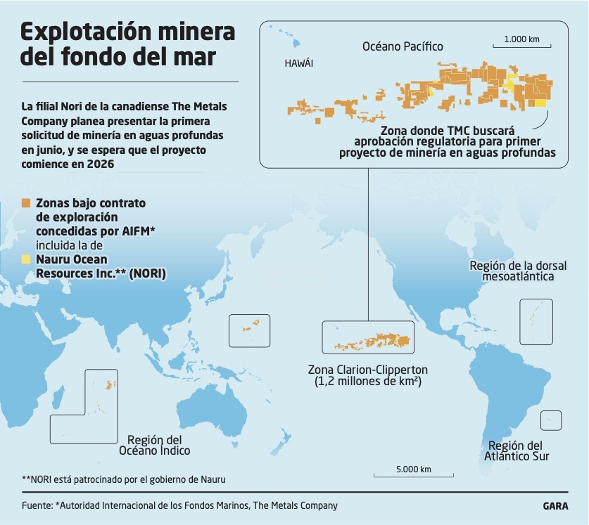 MAR. 23 2025 La industria minera mira ahora con interés a los fondos marinos Durante la segunda quincena de marzo se reúne en Jamaica la Autoridad Internacional de los Fondos Marinos (ISA). En sus manos está decidir si se da vía libre a la minería en las profundidades abisales. La industria presiona a favor de la apertura y las organizaciones sociales por la prudencia, habida cuenta de los peligros y las incertidumbres que encierra. Activistas se manifiestan en Bruselas, frente al Parlamento Europeo, el 6 de marzo de 2023 para detener la minería submarina en aguas profundas. (Kenzo TRIBOUILLARD | AFP) Isidro ESNAOLA De las tierras raras a los minerales estratégicos, el interés por las materias primas minerales no deja de crecer. La apuesta por los coches eléctricos y la necesidad de nuevas y mejores baterías son unos de los principales motivos, pero también el paulatino agotamiento de los yacimientos más superficiales y fáciles de extraer. El aumento de los costes de explotación y la tensa situación geopolítica están impulsando la búsqueda de alternativas. Y algunos han puesto sus ojos en el mar, en los fondos marinos. Precisamente durante esta segunda quincena de marzo la Autoridad Internacional de los Fondos Marinos (ISA, por sus siglas en inglés) se reúne en Jamaica, donde esta organización internacional tiene su sede. Su principal cometido es la gestión de las profundidades abisales y en sus manos está la redacción de un código minero que regule la minería en el fondo del mar. Un documento polémico que tendrá importantes efectos a largo plazo y que ha movilizado a la sociedad civil. UN LARGO CAMINO El origen de ISA se remonta a los años sesenta del siglo pasado, cuando se desarrolló el régimen integral de gobernanza de los océanos. En 1970, la Asamblea General de Naciones Unidas declaró que los recursos minerales de los fondos marinos eran «patrimonio de la humanidad» y, por consiguiente, su explotación debía hacerse «en interés de la humanidad en su conjunto mediante un organismo que se establezca al efecto». En esta declaración está el origen de ISA, que, sin embargo, no se creó hasta el 16 de noviembre de 1994, el mismo día que entró en vigor la Convención de las Naciones Unidas sobre el Derecho del Mar que firmaron 167 Estados -entre los que no está EEUU- y también la UE. Recién creada, los precios de las materias primas empezaron a caer y el interés por la minería en los fondos marinos decayó a la misma velocidad. Hasta ahora el organismo se había limitado a conceder contratos de exploración. Cualquier entidad que tuviera el respaldo de un Estado podía acceder a un contrato de este tipo para explorar una determinada zona del fondo del mar. TIPOS DE DEPÓSITOS ABISALES El interés se centra en tres tipos de depósitos minerales en aguas profundas. El primero serían los nódulos polimetálicos que se encuentran en las llanuras abisales parcialmente cubiertas de sedimentos finos. Los minerales se presentan en forma de trozos del tamaño de una patata, dispersos por el fondo. Contienen un buen número de elementos (hierro, cobre, manganeso, níquel, plomo, cobalto, zinc), así como litio, molibdeno, titanio y niobio en volúmenes interesantes, desde el punto de vista de la extracción. Este es el único tipo de yacimiento que, desde el año 2000, cuenta con norma de exploración. Otro tipo de yacimiento son las llamadas costras de ferromanganeso ricas en cobalto. Se forman en las laderas y cumbres de los montes submarinos entre 400 y 7.000 metros por precipitación de minerales en suspensión en el agua del mar. Además de cobalto, también contienen numerosos metales como manganeso, hierro, cobre, níquel y varios metales raros, incluidos algunos elementos de las tierras raras. Y, por último, los sulfuros polimetálicos. Se forman en los límites de las placas tectónicas y a lo largo de las dorsales oceánicas y los arcos volcánicos, a 2.000 metros de profundidad. Son ricos en hierro, cobre, zinc, plata y oro. En 2022, se contabilizaban 1,5 millones de km2 con licencias de exploración, lo que equivale a la superficie de Mongolia. La mayoría de los contratos se habían concedido en el área Clarion-Clipperton en el océano Pacífico y algunos en el océano Índico. OPERACIONES COMERCIALES Hasta ahora ninguno de los contratistas había mostrado intención de iniciar la extracción industrial. De hecho, existen serias dudas de que haya compañías que hayan desarrollado una tecnología que permita la extracción de mineral de las profundidades abisales que pueda competir con la minería terrestre. EE.UU., con una de las tecnologías oceánicas más avanzadas, ni siquiera ha ratificado la Convención. Sin embargo, en 2021 la república de Nauru anunció que pensaba patrocinar a la empresa canadiense The Metals Company para que extrajera metales en la zona Clarion-Clipperton. Esta petición obligó a ISA a acelerar el desarrollo de la legislación sobre minería, que ya llevaba varios años en discusión. Para complicar más las cosas, en caso de que no se acuerde un código minero existe una cláusula que permitiría resolver provisionalmente las peticiones formuladas para la explotación del fondo marino, circunstancia que ha provocado un aumento de la presión, tanto de las empresas mineras como de las organizaciones ambientales. Estas últimas confían en que la recién elegida, en enero de este año, secretaria de ISA, la oceanóloga brasileña Leticia Carvalho, sea capaz de proteger los océanos de la minería submarina. Su principal preocupación es que las prisas lleven a aprobar un código defectuoso, sin salvaguardas ambientales y plagado de lagunas que dejen las manos libres a los intereses empresariales. Según confirmó Emma Wilson, de la ONG Deep Sea Conservation Coalition, el borrador que circula contiene más de 2.000 elementos que están en debate y que abarcan desde la distribución de los beneficios hasta la
