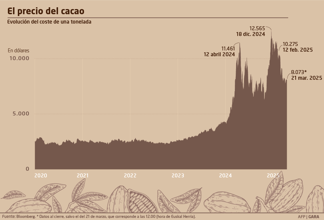 MAR. 24 2025 VAIVENES EN EL MERCADO MUNDIAL DEL CACAO El precio del chocolate muestra su parte más amarga El precio del cacao alcanzó cotas históricas en diciembre de 2024, cuando llegó a superar los 12.500 dólares por tonelada. La tendencia se ha revertido y ahora se negocia en torno a los 8.000 dólares. ¿Qué ha pasado? Excedentes de producción, especulación financiera y crisis climática marcan el incierto futuro del chocolate. A la izquierda, una trabajadora de una plantación de cacao en Costa de Marfil. A la derecha, el pasillo de los chocolates en un supermercado. (Eric LALMAND - Riccardo MILANI | AFP) Ruben PASCUAL hace apenas un par de meses, el compañero Aritz Intxusta explicaba en estas páginas que el café nunca había costado tanto y repasaba los principales factores globales tras ese encarecimiento. Si usted es más de chocolate, sentimos comunicarle que las noticias no son mucho más dulces, como habrá podido comprobar últimamente en los lineales de los supermercados. Comencemos por los datos, y primero por los que afectan directamente a nuestros bolsillos: el observatorio de precios que la OCU hizo público el pasado 27 de febrero recogía que, con respecto a enero, tanto el chocolate con leche como el cacao en polvo estaban entre los alimentos que más se habían encarecido, con alzas del 14% y el 7%, respectivamente. De lo micro a lo macro, observamos que el 18 de diciembre de 2024 el precio de los futuros de cacao tocó techo y marcó un récord al situarse por encima de los 12.500 dólares por tonelada. ¿Es mucho? ¿Poco? Bien, para hacernos una idea, basta con echar la vista atrás. El mismo día del año anterior, estaba a 4.222 dólares. En 2022, teniendo en cuenta que el 18 de diciembre era domingo, miramos la fecha del lunes 19 de diciembre: 2.502 dólares. ¿En 2021? Todavía más barato: 2.472 dólares. El aumento ha sido, por tanto, espectacular. Y escalofriante. Desde aquel pico, la tendencia parece haberse revertido y actualmente los futuros de cacao se negocian alrededor de los 8.000 dólares por tonelada, lo que marca la tasa más baja en cuatro meses. El portal especializado “Trading Economics” apunta que en este descenso influyen tanto «las mejores perspectivas climáticas en la principal región productora de África Occidental» como «las expectativas de un mayor excedente pronosticado para esta temporada». Esta fuente recoge que los agricultores de Costa de Marfil -el mayor productor del mundo por delante de Ghana, ambos suman el 60% de la producción mundial- han informado de lluvias por encima del promedio, combinadas con largos periodos soleados en la mayoría de regiones productoras de cacao, lo que hace esperar que «mejoren las condiciones de cultivo y fortalezcan el desarrollo del cultivo intermedio de abril a septiembre». EXCEDENTE DE SUMINISTRO, DESCENSO DE LA DEMANDA Además, la Organización Internacional del Cacao (ICCO, por sus siglas en inglés) proyecta ahora «un excedente de suministro de 142.000 toneladas para la temporada 2024/25 tras tres años consecutivos de déficits». En este sentido, fuentes locales han confirmado la llegada a los almacenes de Ghana de unas 55.000 toneladas métricas de cacao a finales de enero, lo que acerca al segundo productor mundial a su objetivo de temporada, de acuerdo a la agencia Efe. Por su parte, los agricultores de Costa de Marfil han enviado 1,29 millones de toneladas métricas de cacao hasta el 2 de febrero, un 22% más que el año pasado, aunque el ritmo se ha desacelerado respecto al aumento del 35% de diciembre. No puede decirse, sin embargo, que la incertidumbre haya terminado. La propia ICCO, en sus primeras previsiones para la presente temporada cacaotera, hechas públicas el pasado 28 de febrero, apuntaba que si bien se anticipa un aumento de casi un 7,8% en la oferta mundial con respecto al ejercicio anterior, hasta los 4.840 millones de toneladas, prevé que el todavía elevado costo de las materias primas siga reduciendo el consumo y, por tanto, la demanda. Estima una caída del 4,8%, hasta los 4.650 millones de toneladas. Un peso pesado del sector, como el conglomerado estadounidense del mundo de la confitería Mondelez Internacional -controla, entre otras marcas, Milka, Oreo, Chips Ahoy, Fontaneda, Príncipe, Suchard o Toblerone- advierte de «una posible desaceleración mundial de la demanda de chocolate». Este «actor clave en la industria del chocolate», como lo definió “Trading Economics”, atribuyó «una caída mayor de lo esperado en las ganancias anuales a los precios, sin precedentes, del cacao», en la presentación de sus cuentas anuales el pasado 4 de febrero, según recogió Efe. Esto es relativamente normal, pues hablamos de un producto especialmente sensible al precio: si sube mucho, enseguida se deja de comprar. Así lo señaló Isidro Esnaola en un análisis publicado en GARA a principios de enero, en el que profundizó en las causas de esta estratosférica subida. Apuntaba que una mala cosecha difícilmente puede por sí sola generar y/o explicar este terremoto, y vinculaba lo ocurrido con la entrada en masa y posterior salida de fondos buitre. Históricamente, el mercado de futuros -un sistema de negociación de precios- estaba restringido a productores, distribuidores y transformadores de cada materia prima, lo que protegía a los agricultores ante eventuales caídas de precios y, a su vez, era una salvaguarda frente a movimientos especulativos. La globalización abrió esos mercados especializados a todo tipo de operadores y por esa puerta se colaron también, como elefante en cacharrería, los fondos de cobertura con el único fin de especular. Aquel análisis destacaba que la participación de estos actores en el mercado del cacao alcanzó su máximo allá por mayo de 2023, con el 36%, es decir, algo más de una tercera parte del volumen total, provocando continuos vaivenes en los precios y un mercado mucho más volátil. Las fluctua