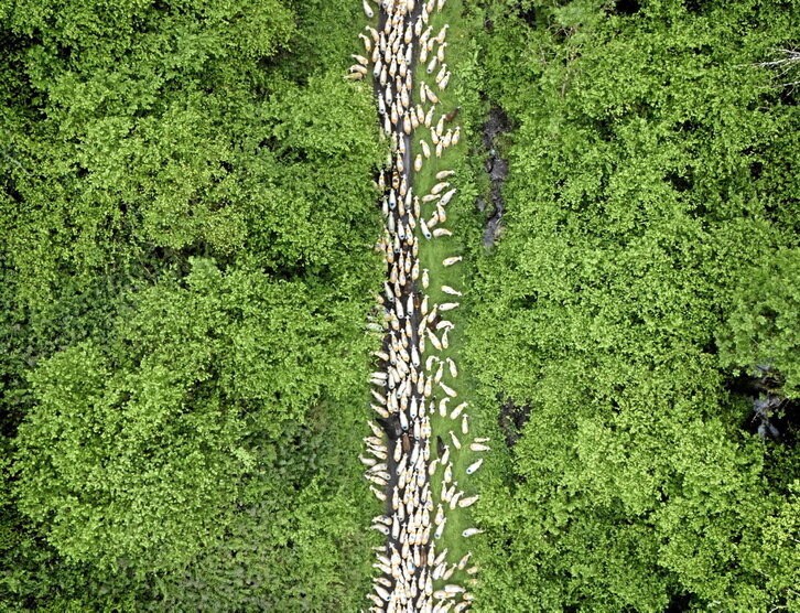 La imagen de cientos de ovejas avanzando hacia los pastos de montaña marca el inicio del verano, tanto a un lado como al otro de los Pirineos. Esta migración estacional permite a los ganaderos aprovechar los verdes prados de altura, mientras preparan el forraje para el invierno. Una costumbre ancestral que aún hoy encarna sostenibilidad, bienestar animal y vínculo con la tierra, como lo demuestra esta fotografía tomada desde el aire en Banhèras de Bigòrra, en el Pirineo occitano, donde la transhumancia se vive y se conmemora cada año con fiestas, mercados y encuentros.