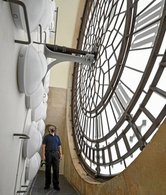 Urtero bezala, londrestar suminduen mezu andana bat jasotzeko prest daude Big Beneko mekanikariak. Arrazoia: larunbatean erlojua ordu batzuetan gelditzea, mekanismoa neguko ordutegira egokitzeko beharrezko prozesua. Udako ordutegiaren aldaketa eta hau dira Parlamentu britainiarrean denbora gelditzen den bi aldi bakarrak. Operazioak erlojua larunbateko 18.00etatik igandeko 02.00etara geldituko du, eta ondo koordinatuta dago. Geldialdian mantentze lanak egiten dituzte. Irudian, Huw Smith, mekanikarietako bat.