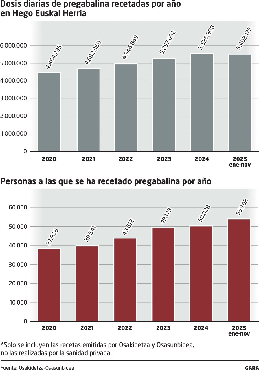 A pesar de este aviso, el consumo ha seguido subiendo. En 2024, en Nafarroa, se recetaron 1,97 millones de dosis diarias de gabapentinoides, de las que 1,48 fueron de pregabalina.