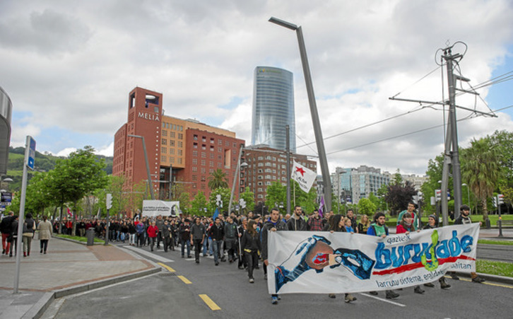 La intervención de Urreta cerró un primer acto, en el que Sienra insistió en la importancia de la lucha para acabar con las altas tasas de paro juvenil, la inmigración o la precariedad, recuperando la capacidad de poder decidir su futuro. Después, se inició la marcha por el paseo de Abandoibarra tras una pancarta con el lema ``Gazteok burujabe larrutu sistema, eraldaketa gure baitan'' a la que siguieron cientos y cientos de personas hasta conformar una comitiva de más de 2.500 personas, entre ellos el veterano militante de la izquierda abertzale Periko Solabarria, que corearon consignas como «independentzia ta sozialismoa», «borroka da bide bakarra», «ea ea ea kale da gurea», «gazte altxa hasi da iraultza», «presoak kalera amnistia osoa» o «gure gorputza gure erabaki».