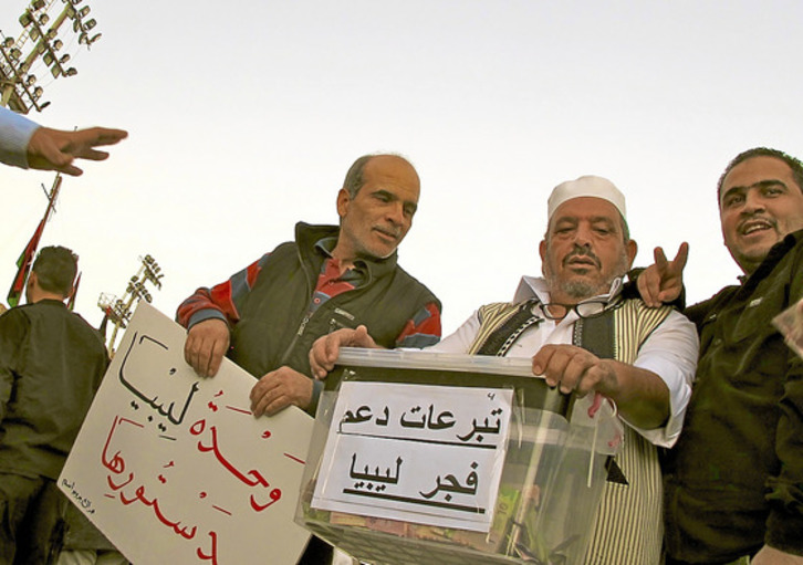 Tarik Hazairi, uno de los voluntarios, enumera lo recogido hasta la fecha: «20.500 dinares libios (unos 11.000 euros), 113 balas de Kalashnikov, 38 tarjetas de teléfono, 18 sacos de dormir y dos botiquines.