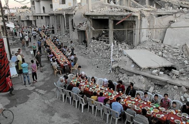 Ilunabarrean, maindire gorriekin apaindutako mahai luzeetan, zukuak, datilak eta albertxikoak. Plateretan, arroz eta ilarrez osatutako ohiko plater arabiarra. Kalearen erdi-erdian ospatu dute Ramadanean zehar eguneko baraualdia apurtzen duen «iftar» gaueko otordua Doumako auzo honetako biztanleek, azken egunotan Siriako hainbat gunetan indarrean den su-etena baliatuz. Mahai ilara luzearen inguruan suntsitutako etxebizitzen hondakinak ageri dira pilatuta, jantoki berezia osatuz. Txoko batean okasiorako prestatutako sukaldea dago, zapi gorri eta guzti. Bertatik banatzen dituzte platerak. Hori bai, gizon eta haurrei soilik. Irudian agertzen ez diren emakumeei etxera eramaten dizkiete –soilik neskatoek hartzen dute parte otorduan–. Damasko ekialdeko hirian «iftar» gaueko otordua elkarrekin egin nahi izan dute, segurtasuna sentituz eta aspaldiko ospakizunak gogoratuz, inguruko hondakinek azken lau urteotako gerra gogorarazten badizkiete ere. Pablo Ruiz de Aretxabaleta