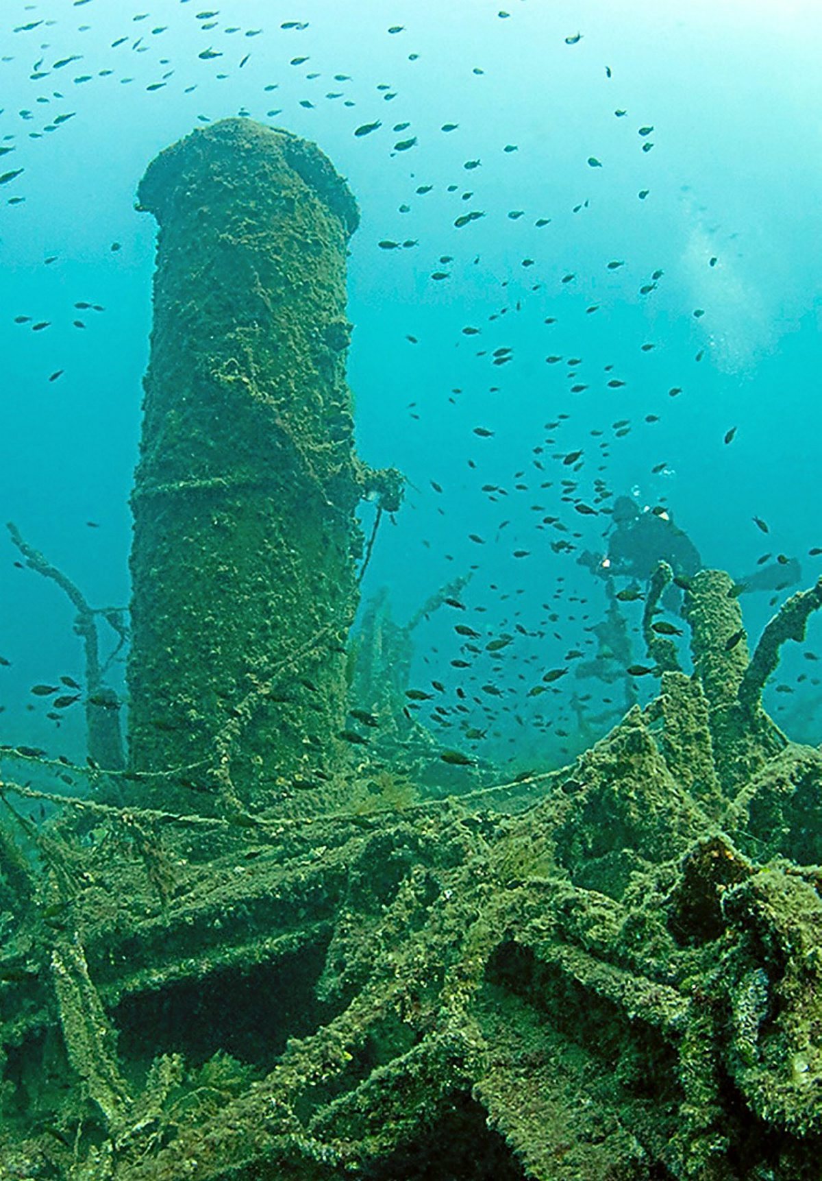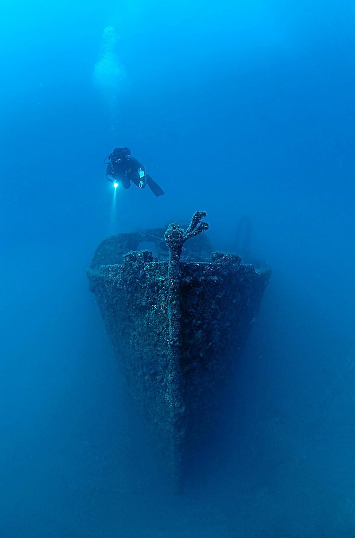 Bidaiaren lehenengo geltokia itsas hondoan 24 metrora dago: «HMS Majestic» Britainia Handiko errege itsas armadako korazatua (120 metroko luzera), Alemaniako itsaspeko batek hondoratu zuena. 100 urte baino gehiago igaro diren arren, armategi guztiak zutik dirau.