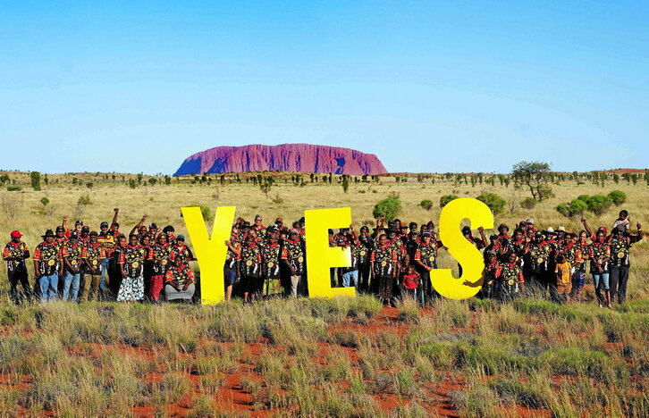 Australian konstituzioa aldatzeko erreferenduma egiten ari dira egunotan, bertako aborigenei parlamentuan hitza hartzeko eskubidea onartu edo ez erabakitzeko. Kontuan izan behar da, Zeelanda Berriak edo Kanadak ez bezala, Australiak ez duela inolako akordio berezirik aborigenekin, eta duela 122 urte kolono britainiarrek idatzitako konstituzioan jatorrizko bertako biztanleak ez direla aipatu ere egiten. Onartuz gero, “Aboriginal and Torres Strait Islander Voice” izeneko baliabideak aukera emango lieke aborigenei parlamentuan haiei eragiten dieten gaiei buruzko iritzia emateko. Gutxieneko eskubidea dirudi, eta Anthony Albanese presidenteak berak onartu du «eskaera oso apala» dela aborigenen aldetik, «ez dutelako beto eskubiderik edo dirulaguntzarik eskatzen, entzunak izatea besterik ez». Baina inkesten arabera badirudi ezezkoak irabaz dezakeela. Izan ere, Australian 26 milioi pertsona bizi dira gaur egun, eta jatorrizko biztanleak %3,2 bakarrik dira. Argazkian, aborigenen ordezkariak baiezkoa eskatzen, Uluru mendi sakratuan.