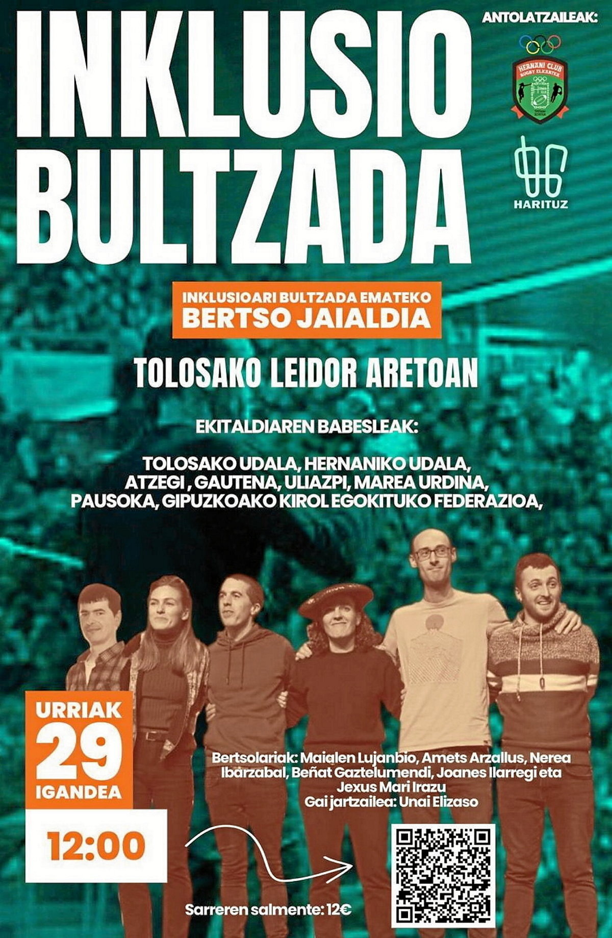 Lehen ekitaldia bihar Tolosako Leidor aretoan ospatuko den bertso jaialdi inklusiboa izango da. "Inklusio bultzada" izena hartu duen saioa 12etan hasiko da, eta oholtzara igoko diren bertsolariak Maialen Lujanbio, Amets Arzallus, Nerea Ibarzabal, Joanes Illarregi, Jexux Mari Irazu eta Beñat Gaztelumendi izango dira.