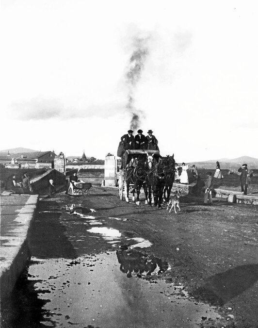 1900. urtean gaude, mende aldaketa betean. Argazkian, diligentzia-auto bat ikus daiteke, Irunberrira eta Zangotzara bidean, Iruñetik irteten. Irudi berezia da, beste garai bateko arratsalde eguzkitsu batean egina. Bidaiariak autoaren barruan zein goiko aldean doaz, ekipajearen ondoan. Kotxea pasatzea ia ikuskizun bat da, txakur bat zaldien ondoan korrika dabilela. Bertan dauden oinezko gutxi horiek bidaiariei begira daude, eta argazkiaren hondoan, berriz, inude bat ikus daiteke, bere haur-kotxetxoarekin paseatzen. Argazki honen egilea Anselmo Goñi Nagore da, jakitun izan gabe duela 100 urte baino gehiago garai hartako bidaiak nolakoak ziren erakusteko testigantza paregabea utzi digun argazki-zalea. Anselmo Goñi medikua eta Iruñeko Udal Ongintzako burua izan zen, eta haren irudi gehienek Nafarroako hiriburuko hiri-paisaiara hurbiltzen gaituzte.