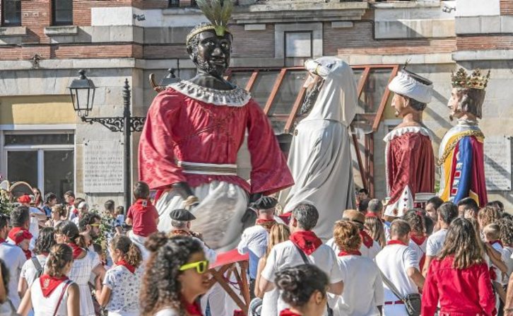 Antes de parar a almorzar en la plaza de San Francisco, los gigantes europeos (Josemiguelerico y Joshepamunda), asiáticos (Sidi abd El Mohame y Esther Arata), africanos (Selim-pia Elcalzao y Larancha-la) y americanos bailan frente a frente, mientras los txistularis y gaiteros tocan la canción “Aitor”. «Tiene un mérito tremendo bailar con tanto peso y tanta gente alrededor», afirma Mikel Oña, padre que acude «todos los días» a seguir el recorrido. Los gigantes pesan una media de 60 kilos, que se suman al peso del propio porteador que, según Andueza, es un factor «muy a tener en cuenta». Los altísimos ingenios miden entre 3,85 y 3,90 metros (unos 4,20, sobre el bailador).